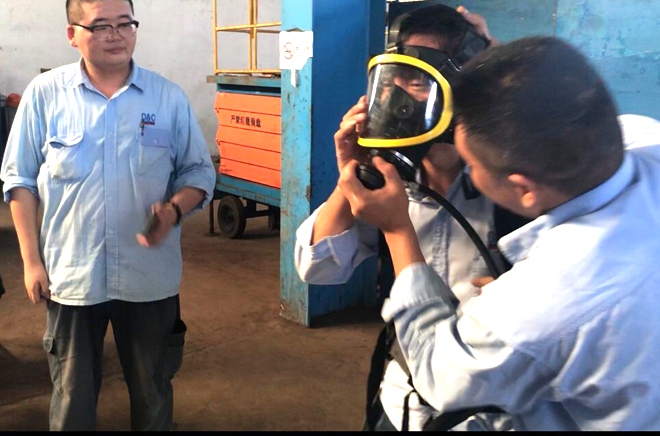 14:00“安康杯”主题活动正式开始,第一项安全知识有奖问答立刻就把主题活动推向了高潮。有奖问答采取电脑随机抽取的形式,抽到谁就由谁回答问题,答对有奖;答错了由其他人补答,答对有奖。比赛进行的非常激烈,特别是有人答错后需要补答时,每个人都摩拳擦掌,蓄势待发,争取抢到补答权。30道题的有奖问答之后,是第二项比赛——正确穿戴正压式呼吸器。这项比赛比的是快速穿戴正压式呼吸器,并保证每个环节、动作要做到位,呼吸器能正常使用。比赛分两组,每组四个代表队,每个代表队派出两名参赛队员,中国员工和印尼员工各自进行比拼。参赛的人员沉着冷静,动作娴熟,很快就完成了比赛。下面的观众神情激动,不停地鼓掌呐喊,为参赛人员加油助威。最终锅炉组中国员工和电气组印尼员工取得胜利。第三项是看图找违章,每只队伍都会有一张相同的图,在十分钟内找的违章多的队伍获胜。最终汽机组中国员工和锅炉组印尼员工获胜。