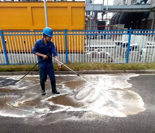 此次清洗使用高压水枪对路面进行冲洗,遇到有油污的路面,工作人员先将洗洁精在水中搅拌,然后用拖把拖洗路面,最后再用高压水枪将油污彻底冲洗干净,一番辛勤的劳动,得来的是干净整洁的路面和靓化的厂区环境。(胡四)