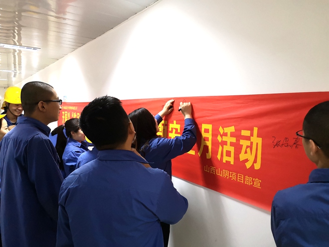 2019年6月,是全国第十八个安全生产月。日前,山阴项目部围绕“防风险、除隐患、遏事故”这一主题,积极开展安全生产月活动,组织全体员工进行了签字仪式,在显目的位置张贴安全月宣传画报。