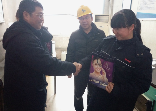 阳春三月,春风送暖,在第108个国际劳动妇女节到来之际,为彰显皖能运检公司人性化管理理念,体现新集项目公司对女员工的关爱,3月8日上午,中煤新集电力公司副总经理刘宝顺和皖能运检新集项目公司总经理乔培生、副经理张立群来到生产岗位,为女职工发放了节日慰问品,并送上祝福。