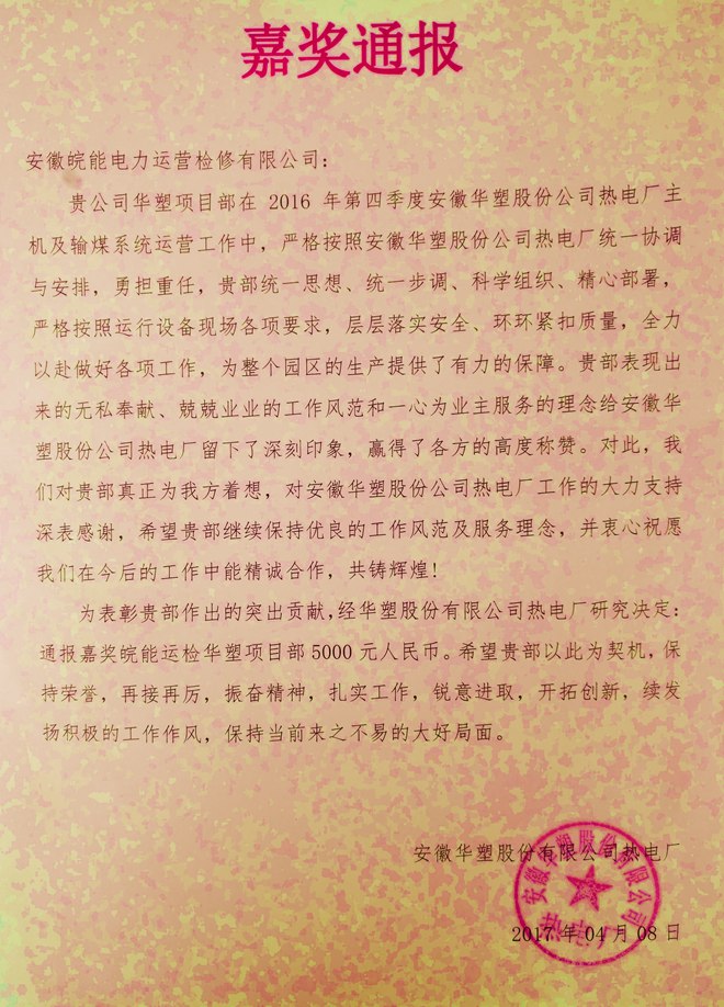 皖能运检华塑项目公司受到华塑股份公司热电厂嘉奖通报