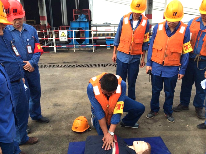 6月23日下午15:30演练正式开始。输煤运行当值领班接到暴雨黄色预警后,立即启动防台防汛应急预案,码头演习人员在执行防台防汛措施时,卸船机1大车在行走到锚定位置时防爬器突然出现故障,领班接到司机汇报,立即通知机务、电气检修人员赶到现场进行消缺,故障刚排除领班又接到卸船机司机汇报现在江面风速己达到18米/秒,这时听见码头上有人高声呼叫“有人落水了、有人落水了”,演习人员们立刻飞奔到落水处,抛下系着缆绳的救生圈,将溺水人员救上岸并让他平躺在地面实施正确的心肺复苏法自救工作,等待救护车的到来……。