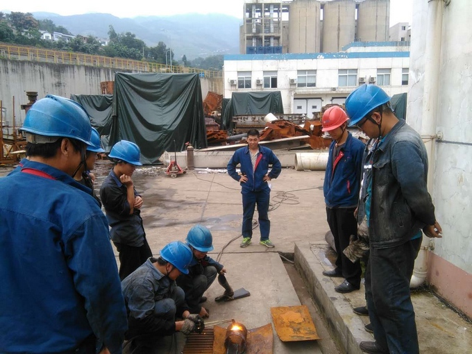 图为员工在室外进行电火焊实操培训