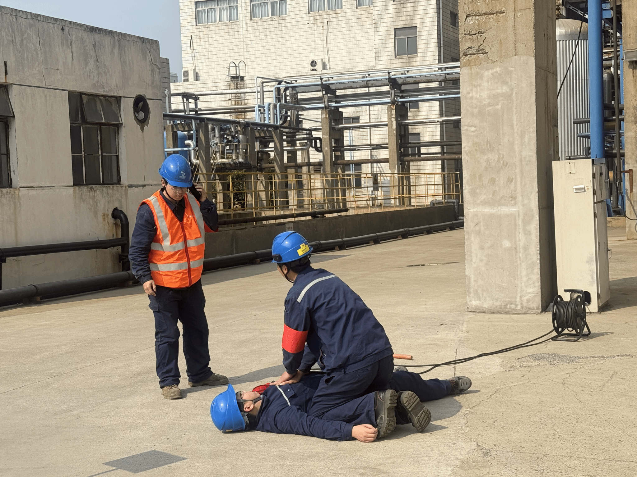 演练模拟#3炉A引风机区域作业人员因电源线绝缘破损不慎触电。险情发生后,现场人员迅速使用绝缘物挑开电线、切断电源并上报,总指挥立即启动应急预案。各应急小组响应迅速、配合紧密:救援组第一时间实施心肺复苏;警戒疏散组有效隔离现场;后勤保障组快速协调救援车辆。整个处置过程科学有序,模拟伤者得到及时转移和救治。